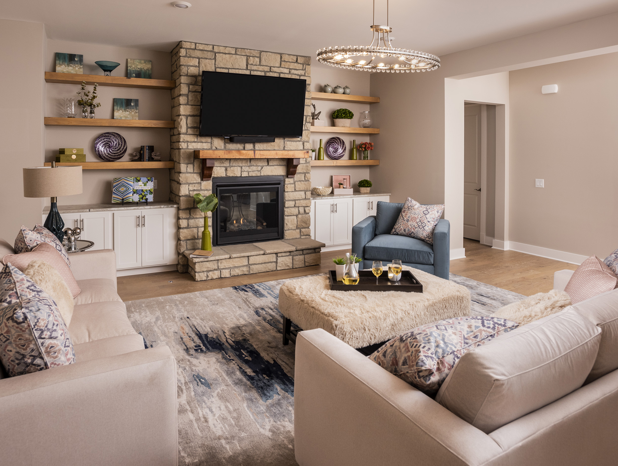 Three pieces become a multi-piece coffee table which becomes the statement furnishing in this odd-shaped room which dictated the design and amplifies the benefit of having a Decorating Den Interiors design professional help you with a particularly challenging space.